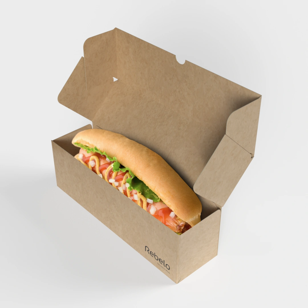 Perfeita para take-away, esta embalagem em cartão FSC combina resistência e consciência ambiental, mantendo o seu cachorro saboroso até ao último momento.