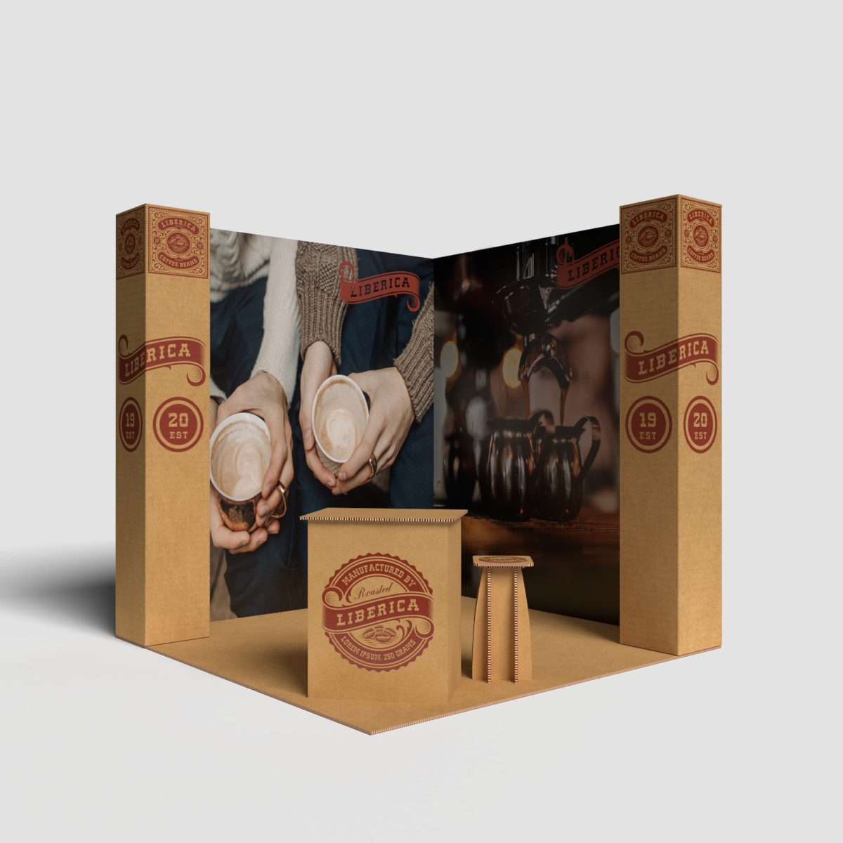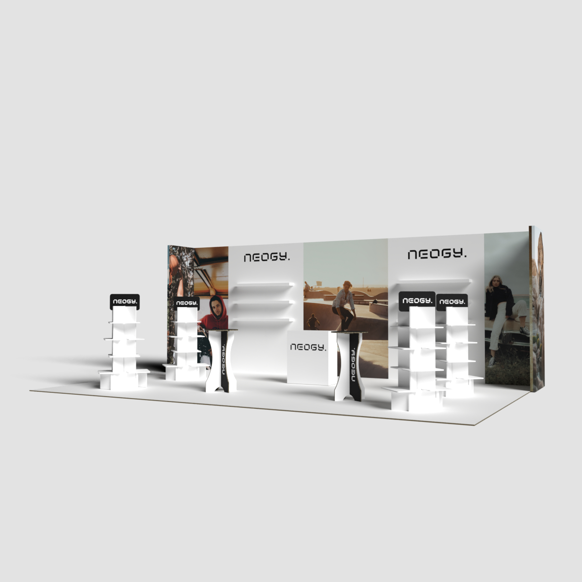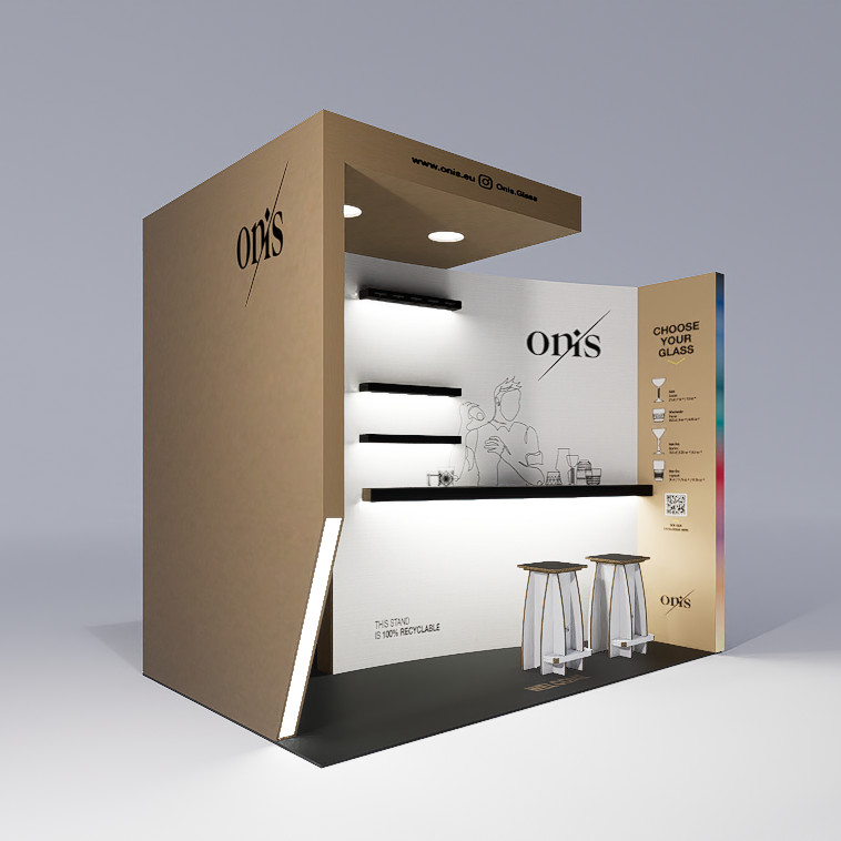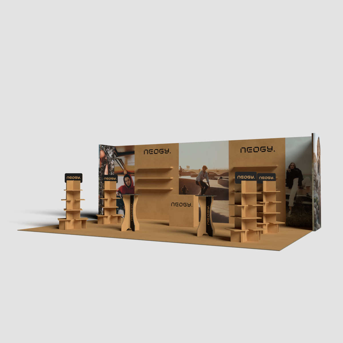 Stand ecológico 100% reciclado e reciclável, em cartão alveolar com impressão direta. Modular, leve e resistente, fácil de montar/desmontar. Ideal para vestuário e artigos de moda, inclui chão personalizável, 6 focos de luz, balcão e área de exposição de produtos. Disponível em cartão kraft natural ou branco.