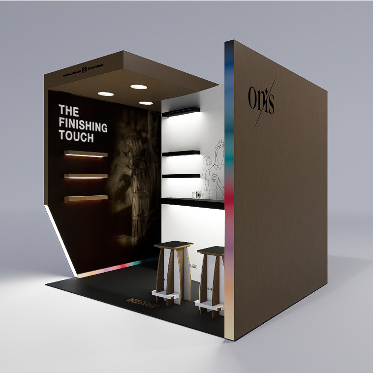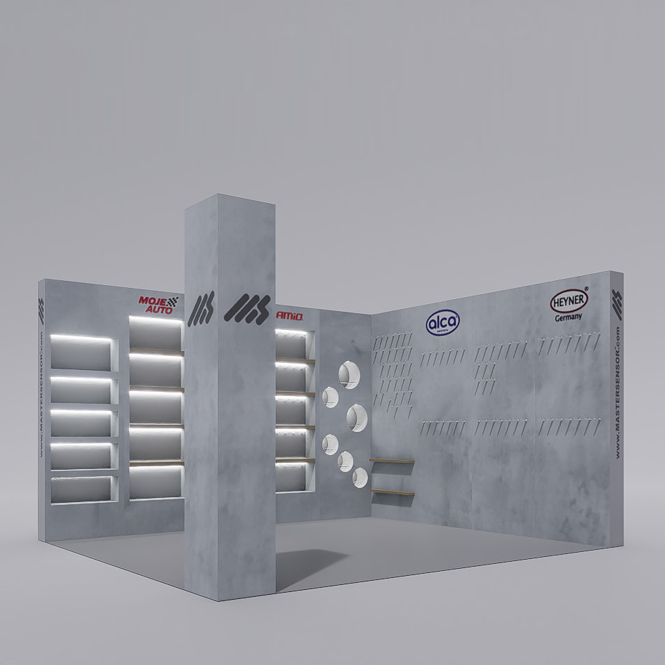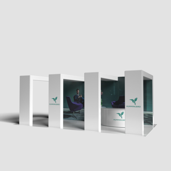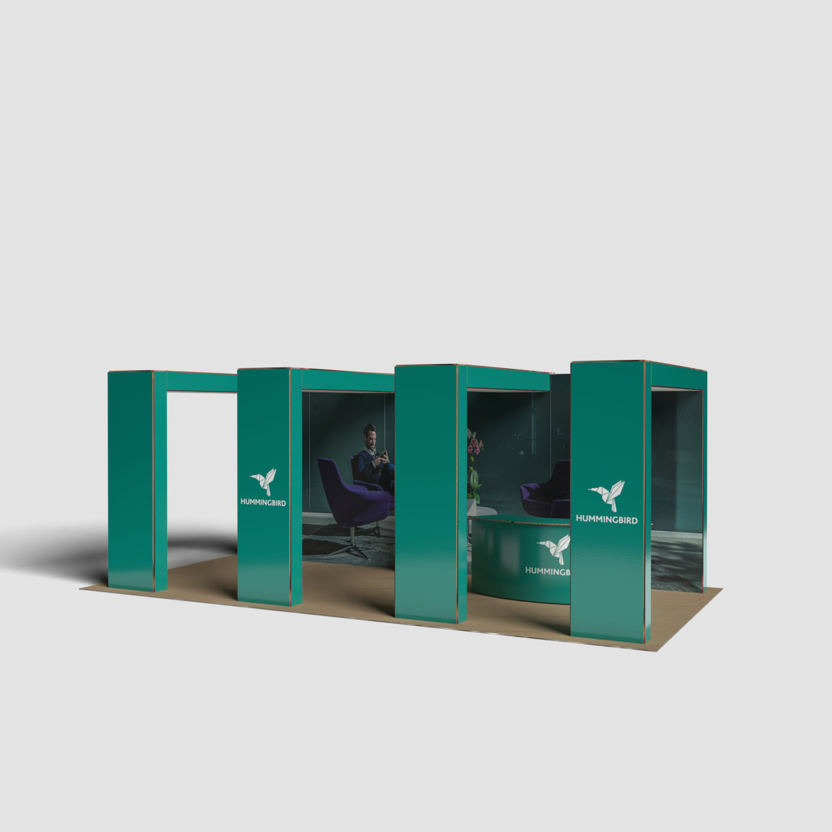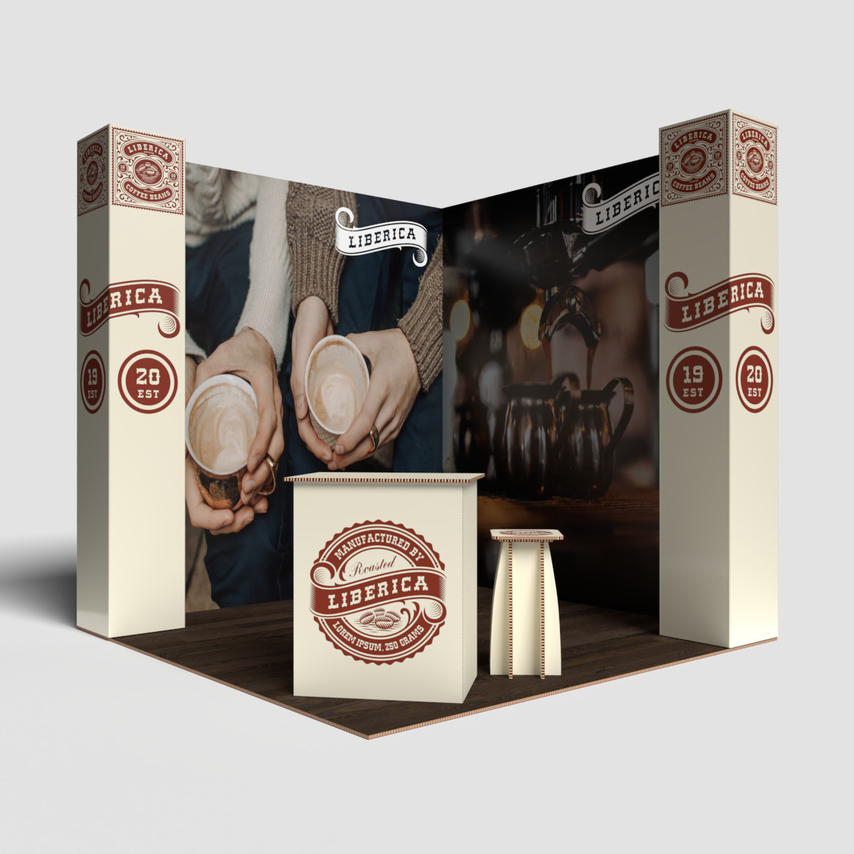 Stand ecológico 100% reciclado e reciclável, em cartão alveolar com impressão direta. Modular, leve e resistente, fácil de montar/desmontar. Ideal para vestuário e artigos de moda, inclui chão personalizável, 6 focos de luz, balcão e área de exposição de produtos. Disponível em cartão kraft natural ou branco.